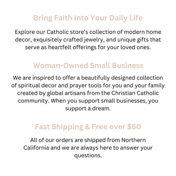 Explore our unique collection of home decor, jewelry, and gifts that beautifully express and celebrate the richness of the Catholic faith.