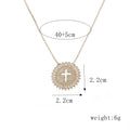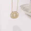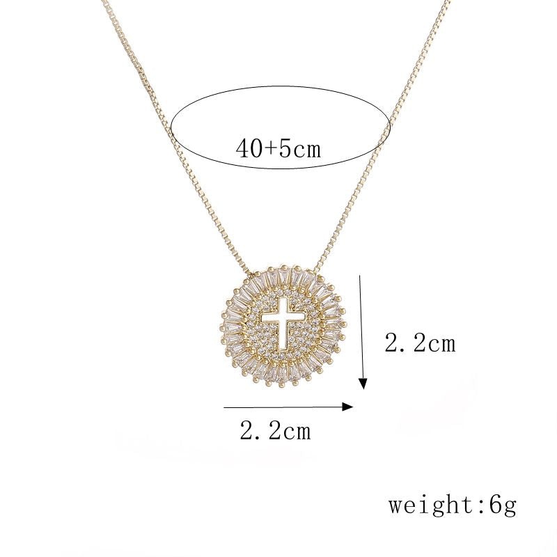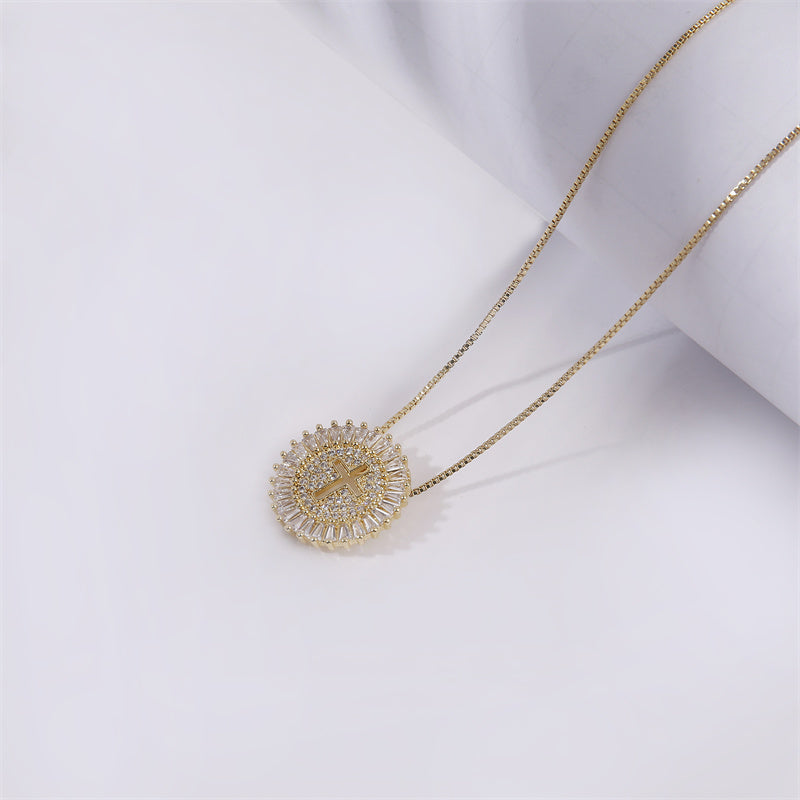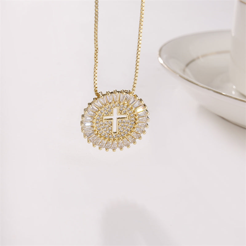 The Cross Coin Pendant Necklace features a cutout cross surrounded by delicate crystals.