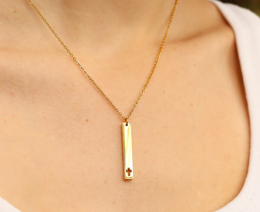 18K Gold Cross Cutout Vertical Bar Necklace is delicate and timeless.