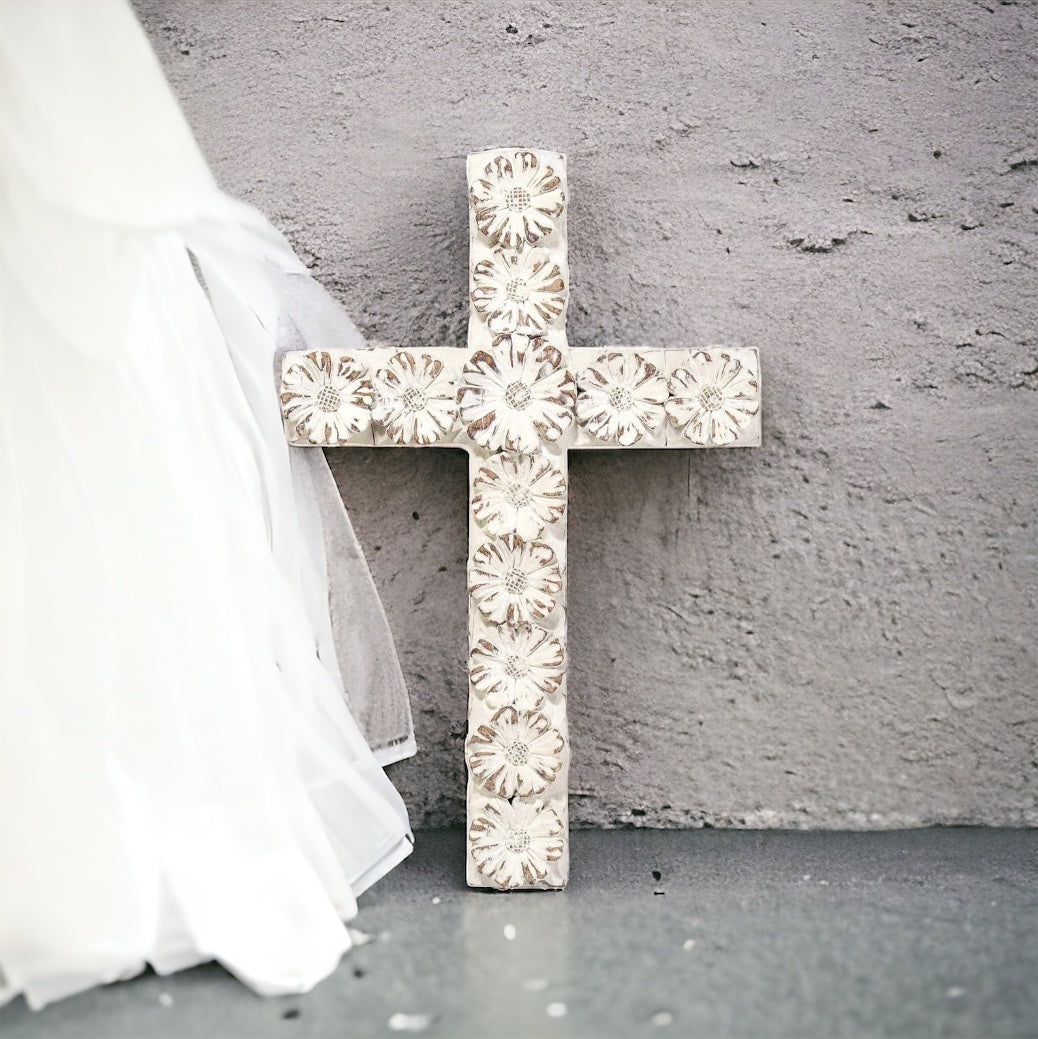 Flower Wall Cross Whitewash 10"