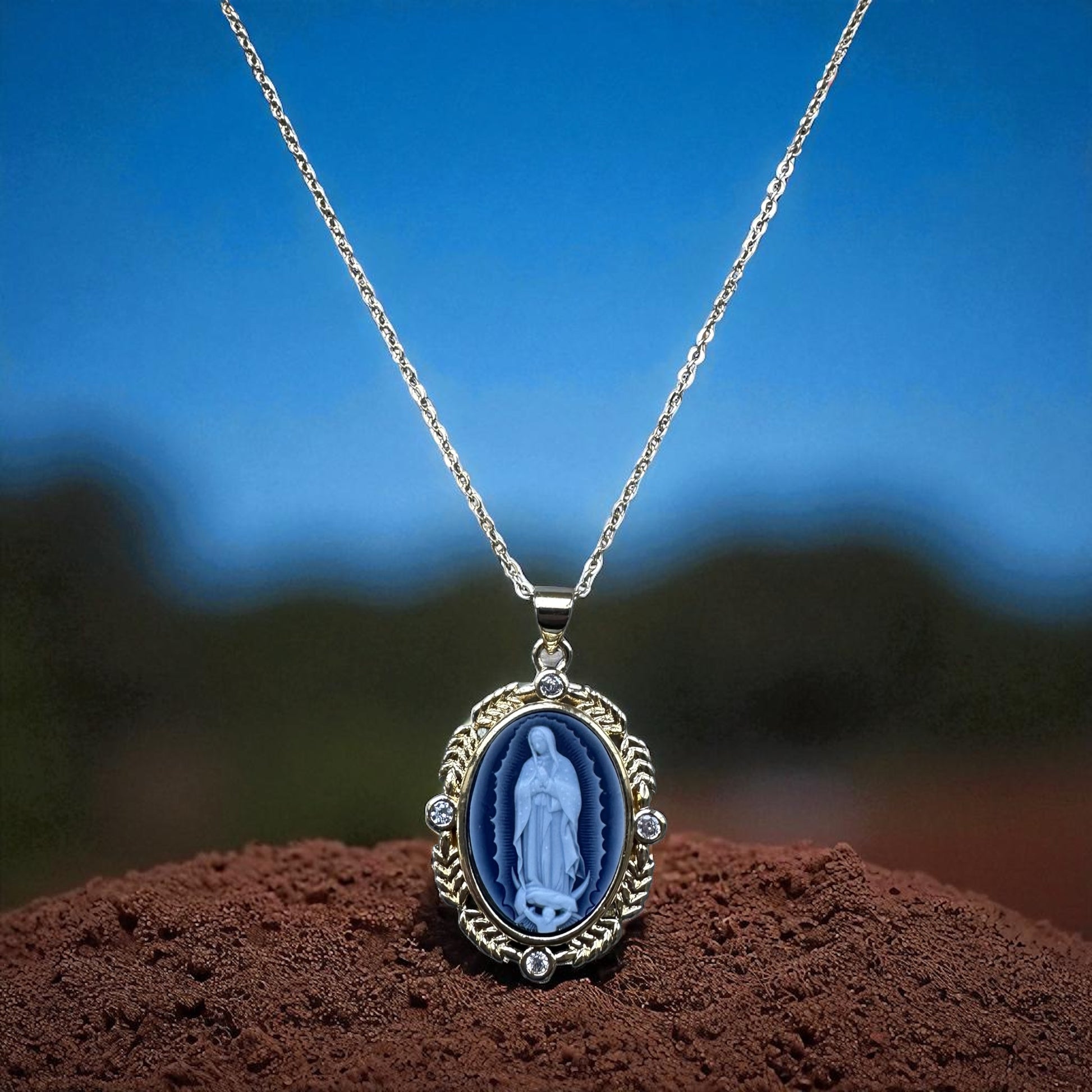 Adorn yourself with timeless elegance and devotion with our Virgin Mary French Blue Cameo Necklace in gold. The striking blue cameo beautifully highlights the serene image of the Blessed Mother, framed in a radiant gold setting and pave cubic zirconia crystals that adds a touch of sophistication.