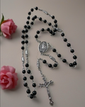 Our Lady of Guadalupe Rosary made with hematite glass beads. Includes silver rosary holder box with mirror (dimensions 2.5"wide)