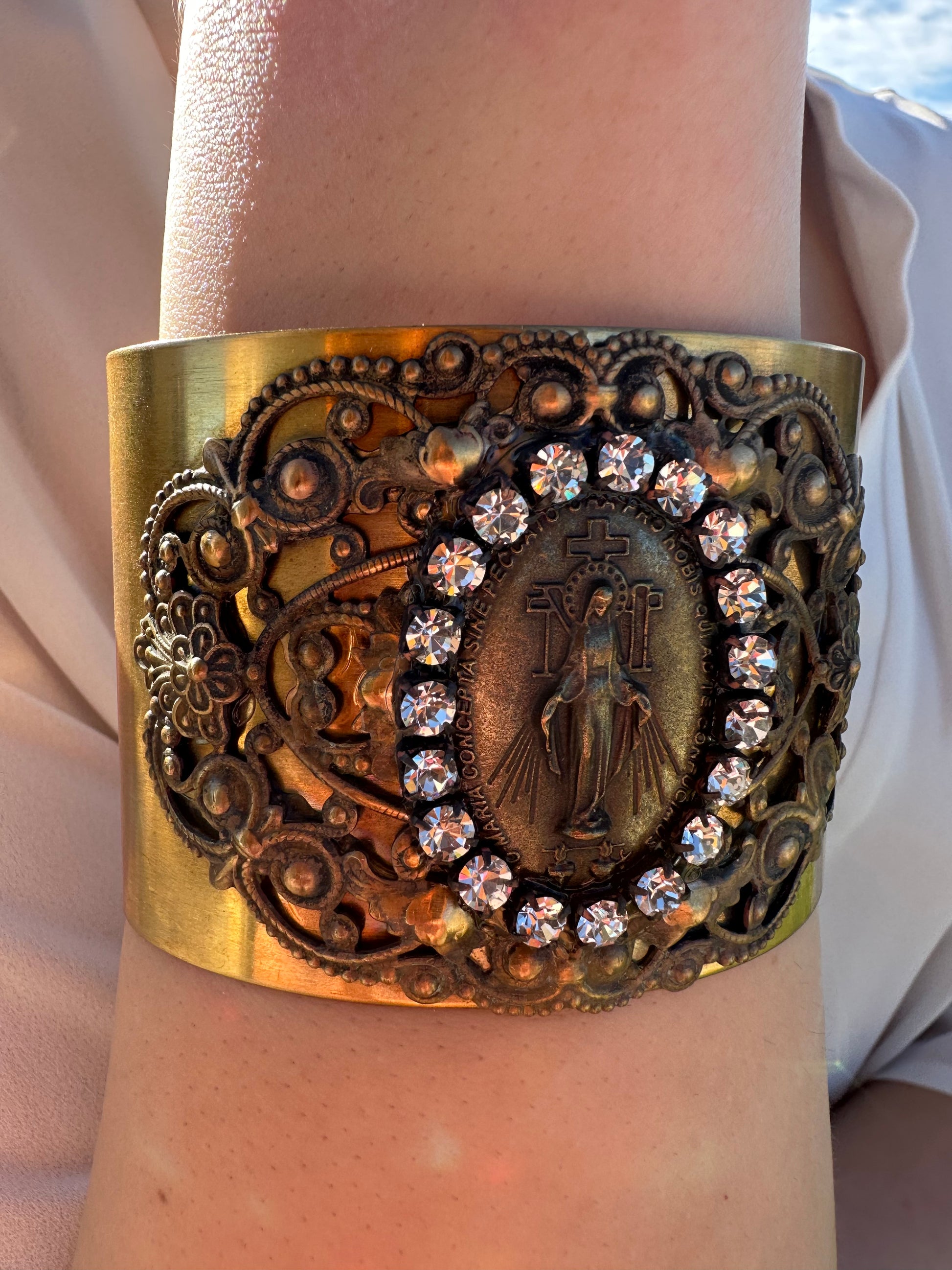 Make a statement with this beautifully designed Vintage Style Cuff Bracelet which features a Miraculous Medal surrounded by clear Swarovski Crystals.