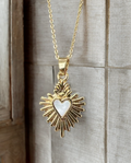 Featuring a sacred heart design embellished with Mother Of Pearl, it creates a captivating iridescent glow. At 18 inches in length with a 2" extender, this necklace is a versatile piece that complements any outfit.