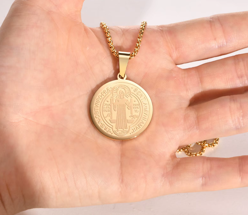 The Saint Benedict Necklace is beautifully engraved and is a timeless high quality piece that features a two sided design and comes in gold or silver.
