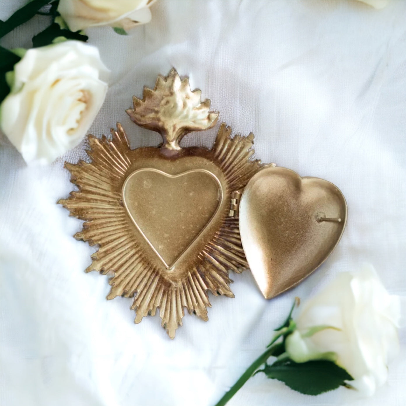 MILAGRO SACRED HEART - The Milagro Heart, deriving its name from the Spanish word for miracle, is a religious folk charm that holds special significance. It can be suspended on altars or worn around the neck of Santos dolls or statues. Within this vintage reproduction design, the heart opens to reveal a sacred space where prayers, wishes, notes of gratitude, a photo, or thanks can be placed. Equipped with a hook on the back, it can also be hung if desired. This cherished item, also known as an ex-voto or sacred heart, serves multiple purposes, including use as a Christmas ornament, holiday decoration, or christening gift.