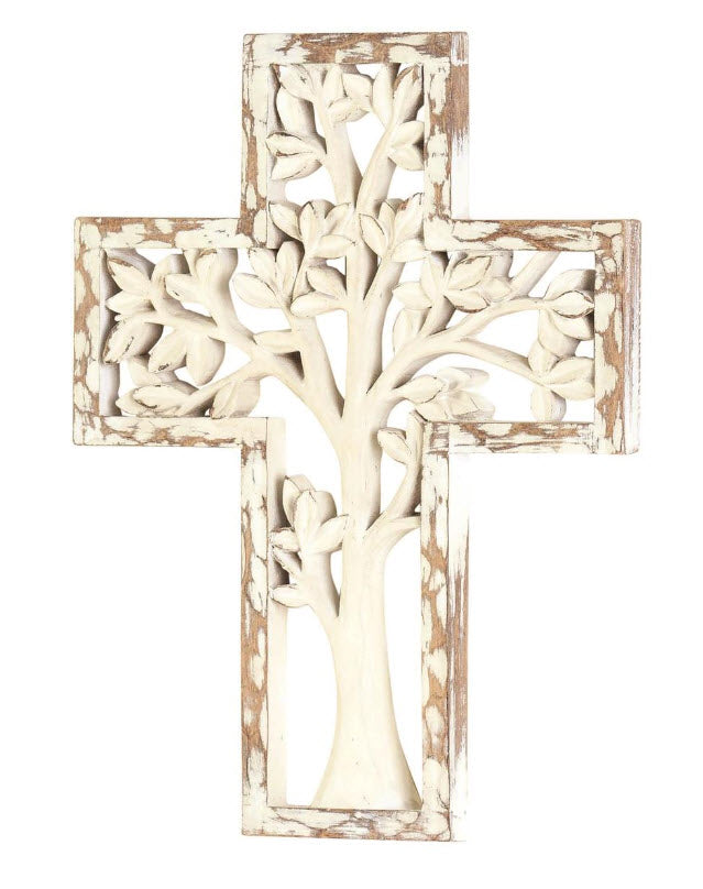 The Tree of Life Wall Cross features a folk art style with an open design. Distressed wood whitewash finish.