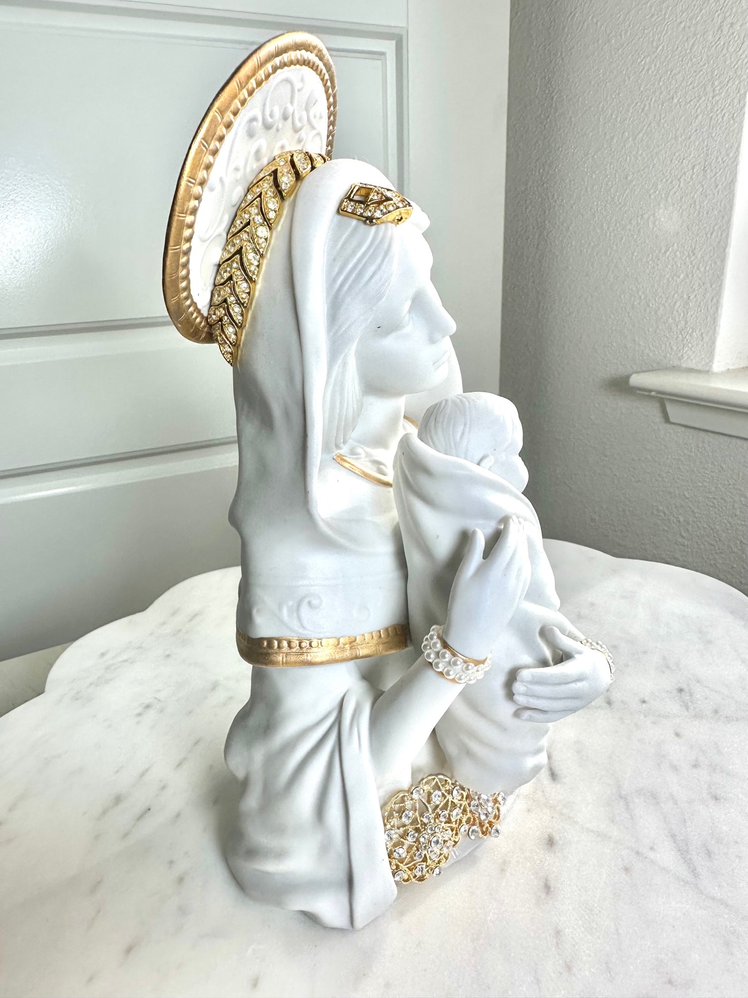 One of a Kind! Vintage Virgin Mary Bust embellished with jewelry and gold accents.
